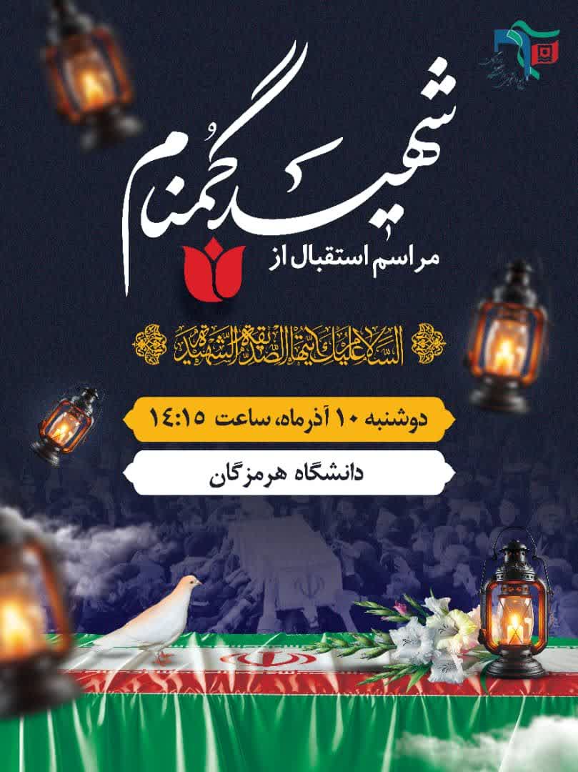 دانشگاه هرمزگان با افتخار اعلام می‌کند که مراسم استقبال از شهید گمنام روز دوشنبه مورخ ۱۰ آذر ۱۴۰۴ از ساعت ۱۴:۱۵ در دانشگاه برگزار خواهد شد. این مراسم معنوی فرصتی است تا اعضای هیأت علمی، کارکنان و دانشجویان با حضور خود، احترام و ارادت خالصانه خود به شهدای گرانقدر و ارزش‌های والای ایثار و فداکاری را نشان دهند.